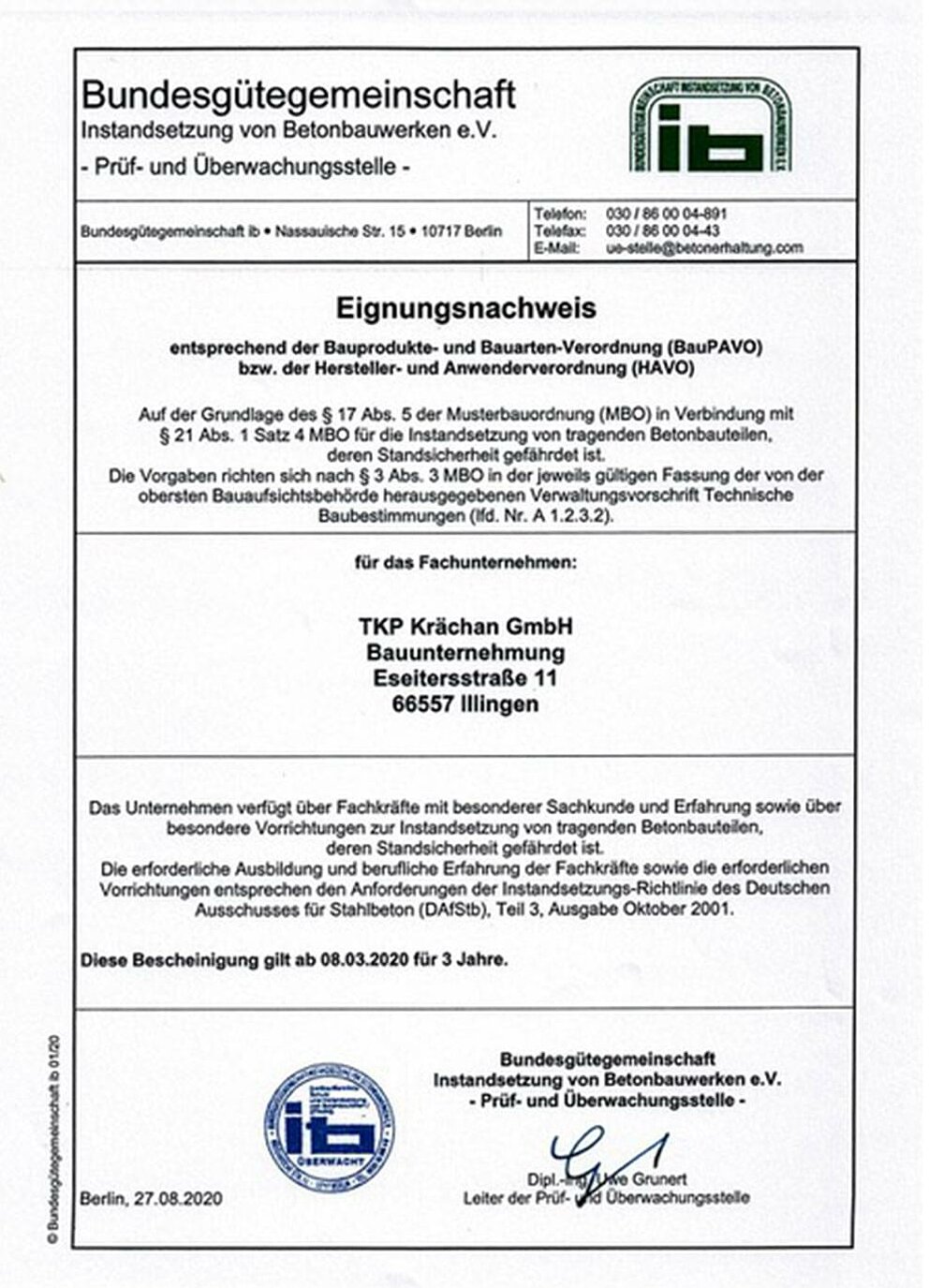 Eignungsnachweis entsprechend der Bauprodukte- und Bauarten-Verordnung (BauPAVO) bzw. der Hersteller- und Anwenderverordnung (HAVO)