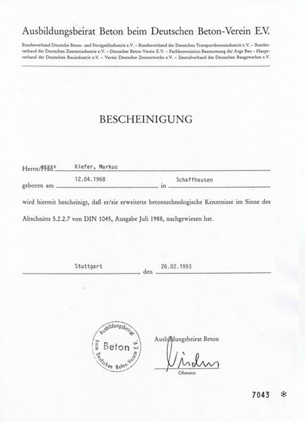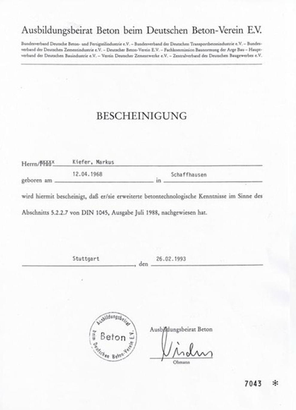 Ausbildungsbeirat Beton beim Deutschen Beton-Verein e. V. Bescheinigung über die erweiterte betontechnologische Kenntnisse im Sinne Abschnitts 5.2.2.7 von DIN 1045, Ausgabe Juli 1988